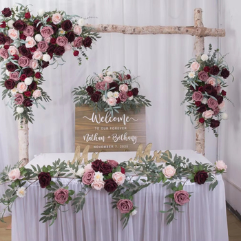 ブルゴーニュローズウィローフラワーアーチスワッグブラッシュアーチ背景ガゼボ結婚式の装飾のためのダスティローズ造花